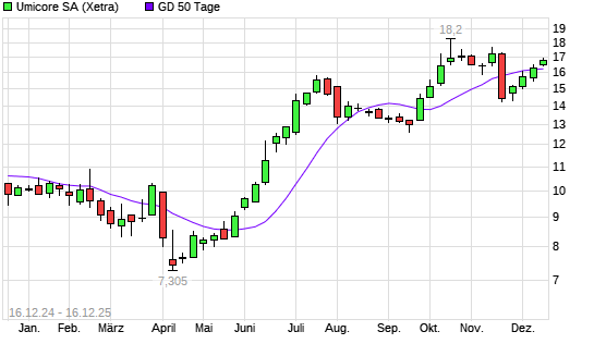 Mit dem Anstieg auf 16,55 EUR hat die Umicore-Aktie am 15.12.2025 die 50-Tage-Linie nach oben gekreuzt.