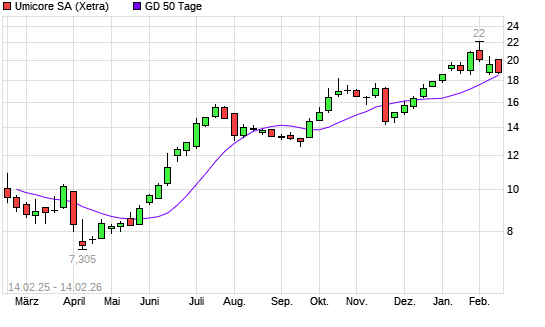 Mit dem Anstieg auf 18,88 EUR hat die Umicore-Aktie am 13.02.2026 die 50-Tage-Linie nach oben gekreuzt.