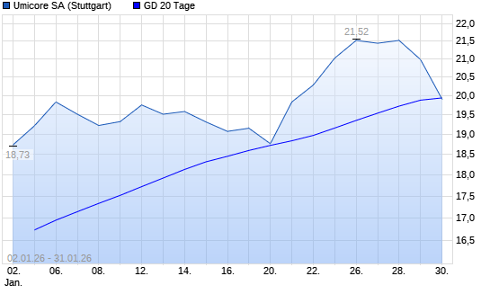 Mit dem Rücksetzer auf 19,93 EUR hat die Umicore-Aktie am 30.01.2026 die 20-Tage-Linie nach unten gekreuzt.