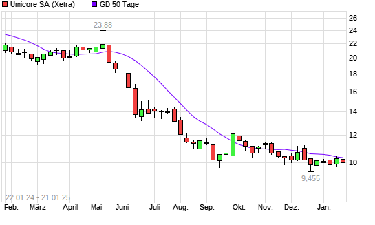 Mit dem Rücksetzer auf 10,19 EUR hat die Umicore-Aktie am 20.01.2025 die 50-Tage-Linie nach unten gekreuzt.