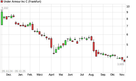 Mit dem Rücksetzer auf 3,71 EUR hat die Under Armour C-Aktie (ISIN US9043112062) am 04.11.2025 ein neues All-Time-Low erreicht und damit den Kurs vom 30.10.2025 eingestellt.