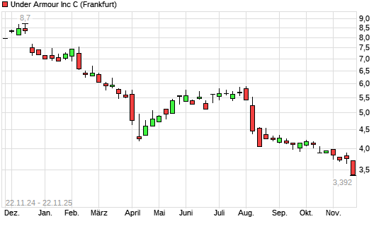 Mit dem Rücksetzer auf 3,39 EUR hat die Under Armour C-Aktie (ISIN US9043112062) am 21.11.2025 ein neues All-Time-Low erreicht und damit den Kurs vom 18.11.2025 eingestellt.