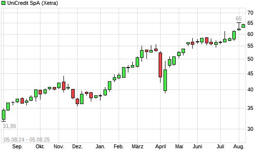 Mit dem Anstieg auf 64,64 EUR hat die UniCredit-Aktie (ISIN IT0005239360) am 04.08.2025 ein neues 10-Jahres-Hoch erreicht und damit den Kurs vom 31.07.2025 eingestellt.