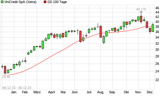 Mit dem Anstieg auf 39,37 EUR hat die UniCredit-Aktie am 05.12.2024 die 100-Tage-Linie nach oben gekreuzt.