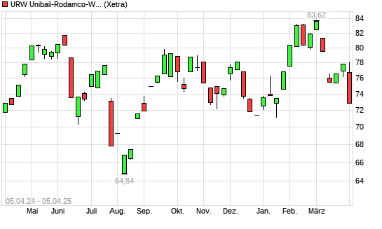 Mit dem Rücksetzer auf 69,08 EUR hat die Unibail-Rodamco-Westfield-Aktie (ISIN FR0013326246) am 04.04.2025 ein neues 6-Monats-Tief erreicht und damit den Kurs vom 20.12.2024 eingestellt.