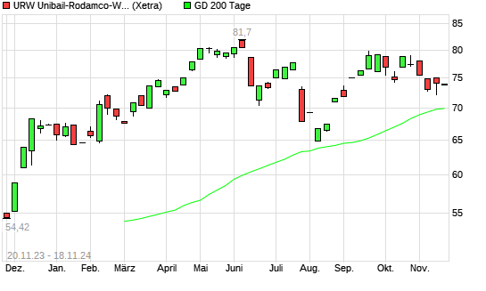 Mit dem Rücksetzer auf 73,62 EUR hat die Unibail-Rodamco-Westfield-Aktie am 18.11.2024 die 200-Tage-Linie nach unten gekreuzt.
