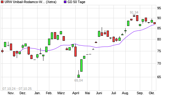 Mit dem Rücksetzer auf 88,00 EUR hat die Unibail-Rodamco-Westfield-Aktie am 06.10.2025 die 50-Tage-Linie nach unten gekreuzt.