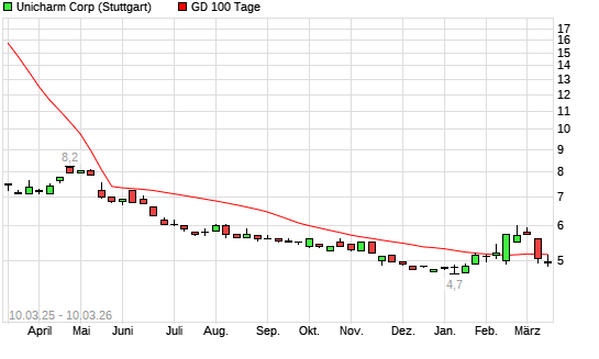 Mit dem Rücksetzer auf 4,96 EUR hat die Unicharm-Aktie am 09.03.2026 die 100-Tage-Linie nach unten gekreuzt.
