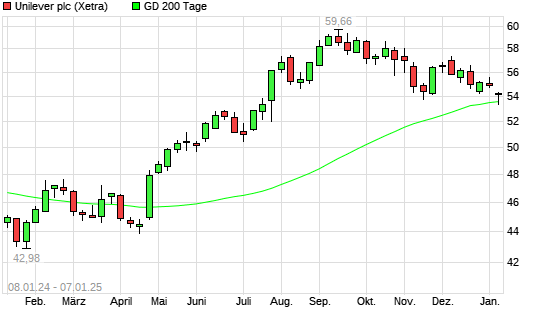 Mit dem Rücksetzer auf 53,32 EUR hat die Unilever-Aktie am 06.01.2025 die 200-Tage-Linie nach unten gekreuzt.
