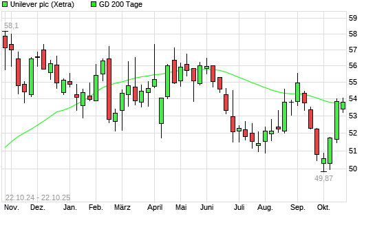 Mit dem Rücksetzer auf 53,72 EUR hat die Unilever-Aktie am 21.10.2025 die 200-Tage-Linie nach unten gekreuzt.
