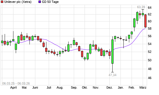 Mit dem Rücksetzer auf 58,00 EUR hat die Unilever-Aktie am 05.03.2026 die 50-Tage-Linie nach unten gekreuzt.Die Unilever-Aktie befindet sich seit dem 30.01.2026 im ...weiterlesen