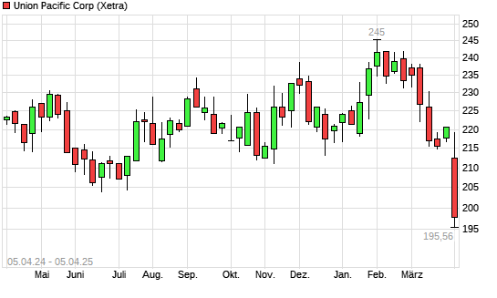 Mit dem Rücksetzer auf 195,62 EUR hat die Union Pacific-Aktie (ISIN US9078181081) am 04.04.2025 ein neues 12-Monats-Tief erreicht und damit den Kurs vom 09.07.2024 eingestellt.