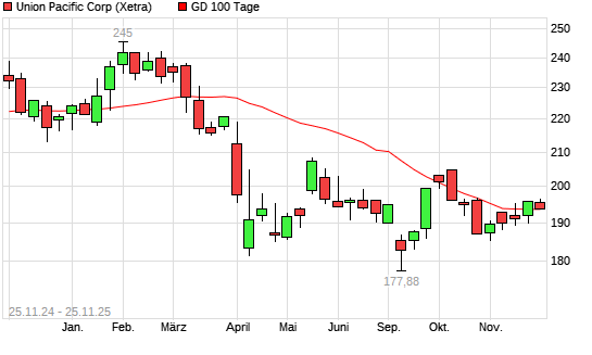 Mit dem Anstieg auf 193,30 EUR hat die Union Pacific-Aktie am 24.11.2025 die 100-Tage-Linie nach oben gekreuzt.