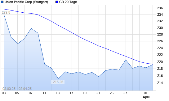 Mit dem Anstieg auf 219,45 EUR hat die Union Pacific-Aktie am 01.04.2025 die 20-Tage-Linie nach oben gekreuzt.