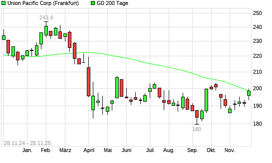 Mit dem Anstieg auf 199,54 EUR hat die Union Pacific-Aktie am 27.11.2025 die 200-Tage-Linie nach oben gekreuzt.