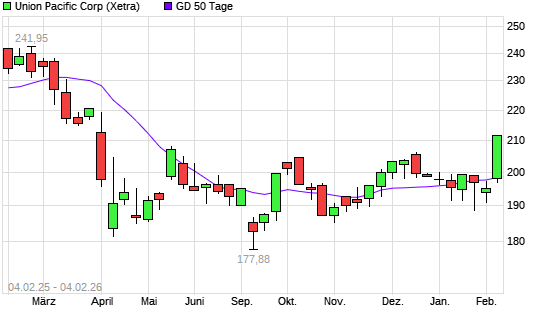 Mit dem Anstieg auf 201,45 EUR hat die Union Pacific-Aktie am 03.02.2026 die 50-Tage-Linie nach oben gekreuzt.