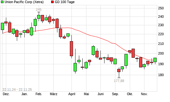 Mit dem Rücksetzer auf 191,36 EUR hat die Union Pacific-Aktie am 21.11.2025 die 100-Tage-Linie nach unten gekreuzt.