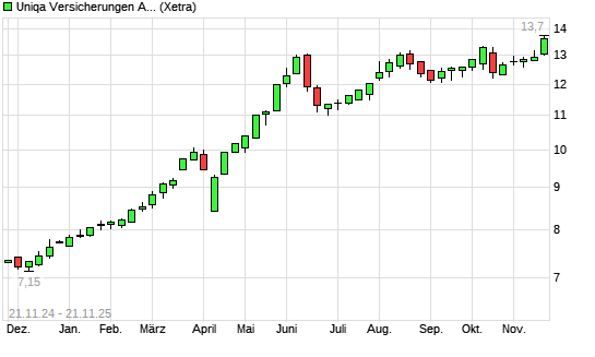Mit dem Anstieg auf 13,60 EUR hat die Uniqa Versicherungen-Aktie (ISIN AT0000821103) am 20.11.2025 ein neues 10-Jahres-Hoch erreicht und damit den Kurs vom 17.11.2025 eingestellt.