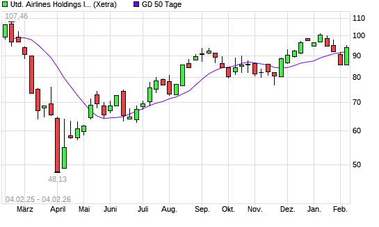 Mit dem Anstieg auf 93,73 EUR hat die United Airlines-Aktie am 03.02.2026 die 50-Tage-Linie nach oben gekreuzt.