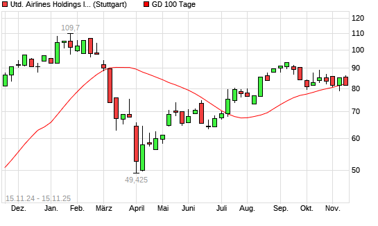 Mit dem Rücksetzer auf 81,73 EUR hat die United Airlines-Aktie am 14.11.2025 die 100-Tage-Linie nach unten gekreuzt.