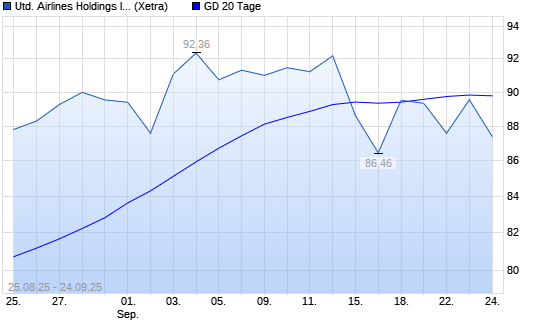 Mit dem Rücksetzer auf 87,60 EUR hat die United Airlines-Aktie am 23.09.2025 die 20-Tage-Linie nach unten gekreuzt.