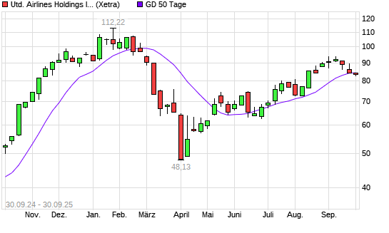Mit dem Rücksetzer auf 83,80 EUR hat die United Airlines-Aktie am 29.09.2025 die 50-Tage-Linie nach unten gekreuzt.