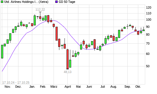 Mit dem Rücksetzer auf 84,30 EUR hat die United Airlines-Aktie am 16.10.2025 die 50-Tage-Linie nach unten gekreuzt.