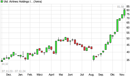 Mit dem Anstieg auf 80,74 EUR hat die United Continental Holdings-Aktie (ISIN US9100471096) am 06.11.2024 ein neues 3-Jahres-Hoch erreicht und damit den Kurs vom 31.10.2024 eingestellt.