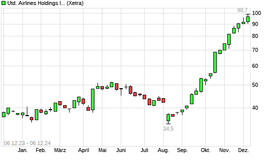 Mit dem Anstieg auf 98,96 EUR hat die United Continental Holdings-Aktie (ISIN US9100471096) am 05.12.2024 ein neues All-Time-High erreicht und damit den Kurs vom 26.11.2024 eingestellt.
