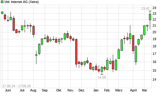 Mit dem Anstieg auf 22,94 EUR hat die United Internet-Aktie (ISIN DE0005089031) am 16.05.2025 ein neues 6-Monats-Hoch erreicht und damit den Kurs vom 13.05.2025 eingestellt.