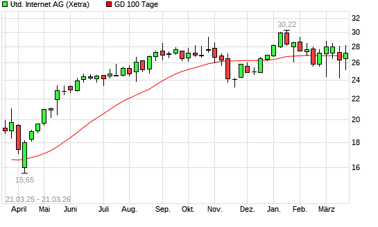 Mit dem Anstieg auf 27,38 EUR hat die United Internet-Aktie am 20.03.2026 die 100-Tage-Linie nach oben gekreuzt.