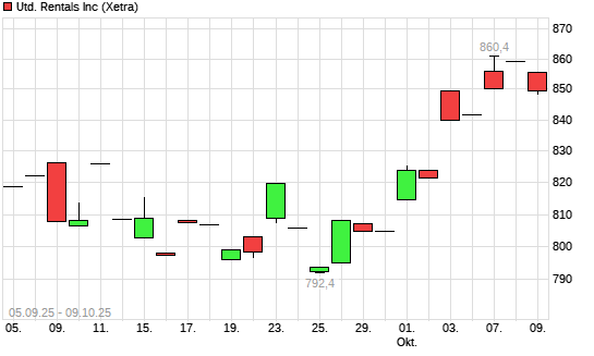 Mit dem Anstieg auf 846,00 EUR hat die United Rentals-Aktie (ISIN US9113631090) am 08.10.2025 ein neues All-Time-High erreicht und damit den Kurs vom 07.10.2025 eingestellt.