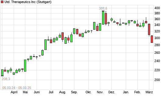 Mit dem Rücksetzer auf 295,00 EUR hat die United Therapeutics-Aktie (ISIN US91307C1027) am 04.03.2025 ein neues 6-Monats-Tief erreicht und damit den Kurs vom 03.03.2025 eingestellt.
