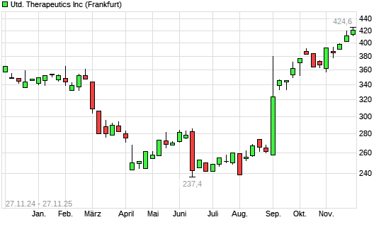 Mit dem Anstieg auf 424,00 EUR hat die United Therapeutics-Aktie (ISIN US91307C1027) am 26.11.2025 ein neues All-Time-High erreicht und damit den Kurs vom 25.11.2025 eingestellt.