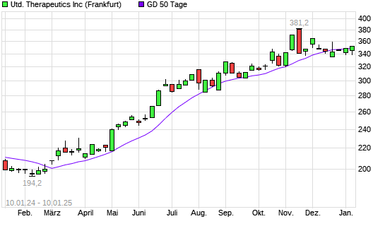 Mit dem Anstieg auf 352,40 EUR hat die United Therapeutics-Aktie am 09.01.2025 die 50-Tage-Linie nach oben gekreuzt.