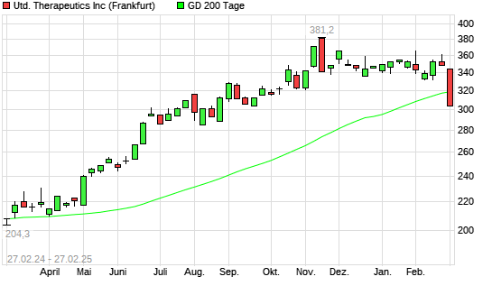 Mit dem Rücksetzer auf 309,90 EUR hat die United Therapeutics-Aktie am 26.02.2025 die 200-Tage-Linie nach unten gekreuzt.