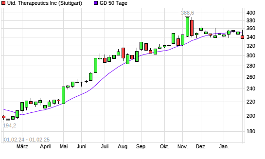 Mit dem Rücksetzer auf 343,00 EUR hat die United Therapeutics-Aktie am 31.01.2025 die 50-Tage-Linie nach unten gekreuzt.