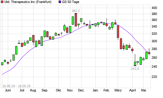 Mit dem Rücksetzer auf 265,30 EUR hat die United Therapeutics-Aktie am 15.05.2025 die 50-Tage-Linie nach unten gekreuzt.