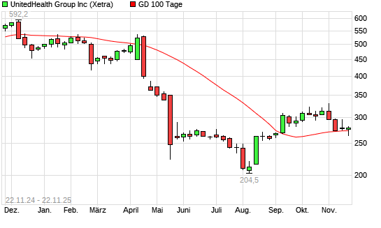 Mit dem Anstieg auf 279,30 EUR hat die UnitedHealth Group-Aktie am 21.11.2025 die 100-Tage-Linie nach oben gekreuzt.