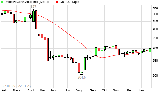 Mit dem Anstieg auf 295,00 EUR hat die UnitedHealth Group-Aktie am 21.01.2026 die 100-Tage-Linie nach oben gekreuzt.