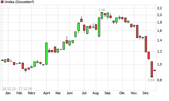 Mit dem Rücksetzer auf 0,85 EUR hat die Unitika-Aktie (ISIN JP3951200009) am 16.12.2024 ein neues All-Time-Low erreicht und damit den Kurs vom 13.12.2024 eingestellt.