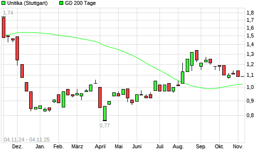 Mit dem Anstieg auf 1,10 EUR hat die Unitika-Aktie am 03.11.2025 die 200-Tage-Linie nach oben gekreuzt.