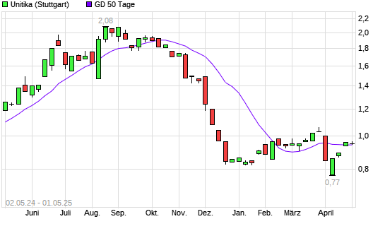 Mit dem Rücksetzer auf 0,94 EUR hat die Unitika-Aktie am 30.04.2025 die 50-Tage-Linie nach unten gekreuzt.