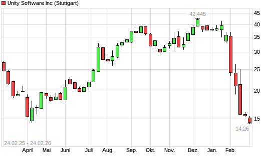 Mit dem Rücksetzer auf 14,31 EUR hat die Unity Software-Aktie (ISIN US91332U1016) am 23.02.2026 ein neues 12-Monats-Tief erreicht und damit den Kurs vom 08.04.2025 eingestellt.