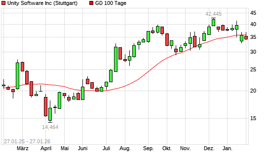 Mit dem Anstieg auf 36,03 EUR hat die Unity Software-Aktie am 26.01.2026 die 100-Tage-Linie nach oben gekreuzt.