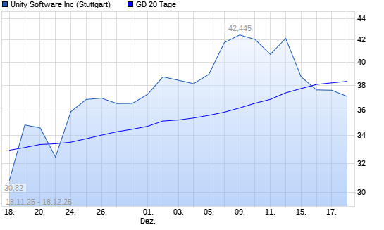 Mit dem Rücksetzer auf 37,26 EUR hat die Unity Software-Aktie am 17.12.2025 die 20-Tage-Linie nach unten gekreuzt.