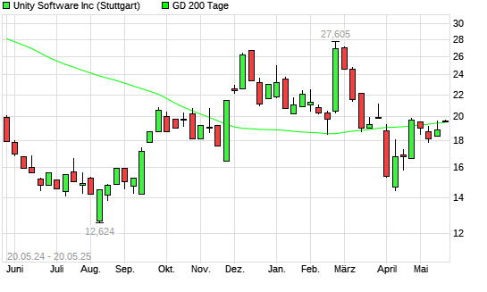 Mit dem Rücksetzer auf 19,72 EUR hat die Unity Software-Aktie am 19.05.2025 die 200-Tage-Linie nach unten gekreuzt.