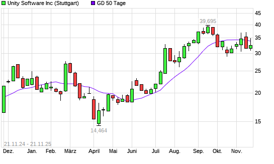 Mit dem Rücksetzer auf 32,70 EUR hat die Unity Software-Aktie am 20.11.2025 die 50-Tage-Linie nach unten gekreuzt.
