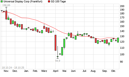 Mit dem Anstieg auf 127,30 EUR hat die Universal Display-Aktie am 17.10.2025 die 100-Tage-Linie nach oben gekreuzt.