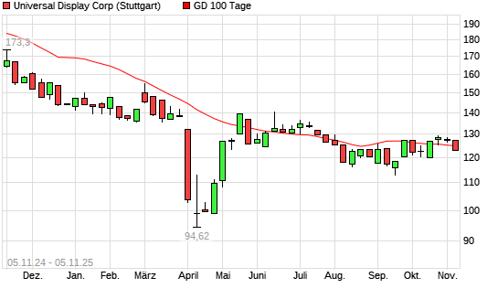 Mit dem Rücksetzer auf 124,90 EUR hat die Universal Display-Aktie am 04.11.2025 die 100-Tage-Linie nach unten gekreuzt.